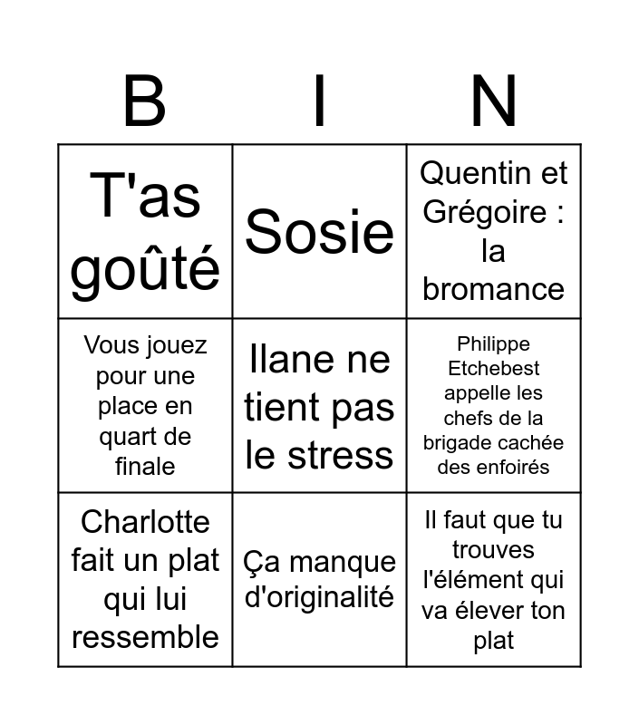 This bingo card has a free space and 8 words: Philippe Etchebest appelle les chefs de la brigade cachée des enfoirés, Quentin et Grégoire : la bromance, Sosie, Charlotte fait un plat qui lui ressemble, T'as goûté, Il faut que tu trouves l'élément qui va élever ton plat, Vous jouez pour une place en quart de finale and Ça manque d'originalité.