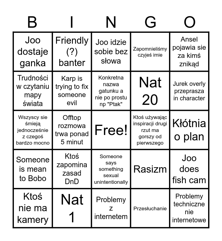 This bingo card has a free space and 30 words: Nat 1, Someone gets downed in combat, Offtop rozmowa trwa ponad 5 minut, Kłócimy sie wśród drużyny, Joo dostaje ganka, Joo idzie sobie bez słowa, Karp is trying to fix someone evil, Someone says something sexual unintentionally, Ktoś używając inspiracji drugi rzut ma gorszy od pierwszego, Problemy z internetem, Kłótnia o plan, Problemy techniczne nie internetowe, Przesłuchanie, Valak oddala sie od grupy, Jurek overly przeprasza in character, Dm cries (almost), Rasizm, Someone is mean to Bobo, Ktoś zapomina zasad DnD, Ansel pojawia sie za kimś znikąd, Wszyscy sie śmieją jednocześnie z czegoś bardzo mocno, Friendly fire, Friendly (?) banter, Nat 20, Trudności w czytaniu mapy świata, Zapomnieliśmy czyjeś imie, Joo does fish cam, Ktoś nie ma kamery, Konkretna nazwa gatunku a nie po prostu np "Ptak" and "rzuć D100".
