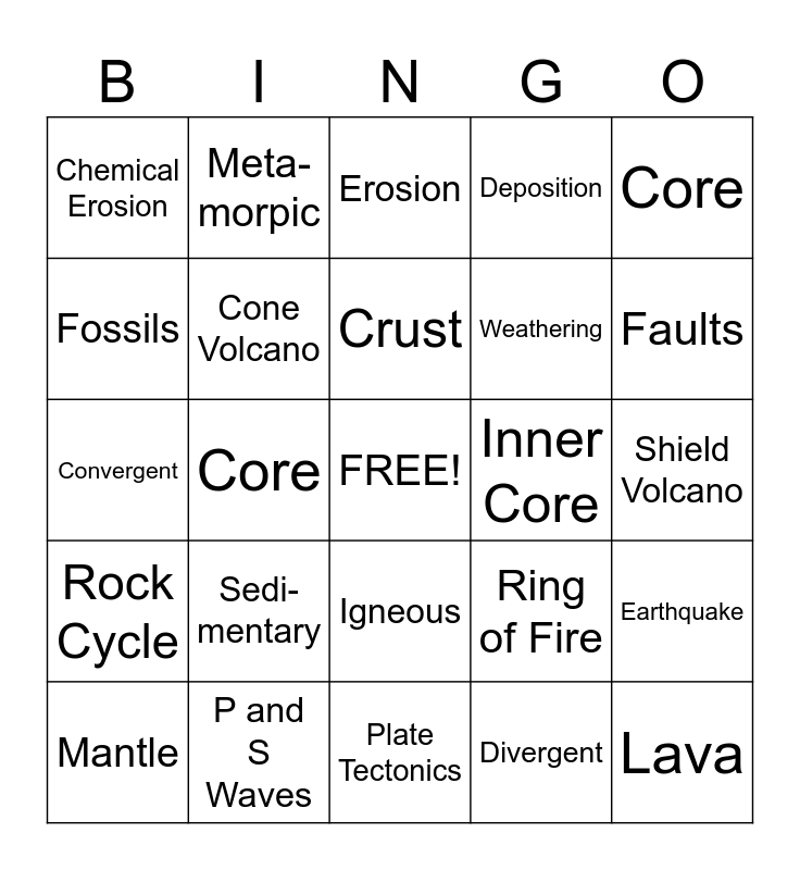 This bingo card has a free space and 24 words: Sedi- mentary, P and S Waves, Crust, Mantle, Core, Chemical Erosion, Fossils, Meta- morpic, Inner Core, Igneous, Weathering, Convergent, Ring of Fire, Earthquake, Cone Volcano, Divergent, Shield Volcano, Erosion, Faults, Core, Lava, Rock Cycle, Deposition and Plate Tectonics.