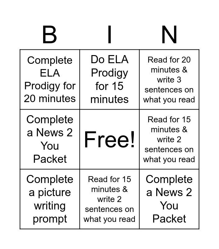 This bingo card has a free space and 8 words: Read for 15 minutes & write 2 sentences on what you read, Read for 20 minutes & write 3 sentences on what you read, Do ELA Prodigy for 15 minutes, Complete a picture writing prompt, Complete ELA Prodigy for 20 minutes, Complete a News 2 You Packet, Complete a News 2 You Packet and Read for 15 minutes & write 2 sentences on what you read.