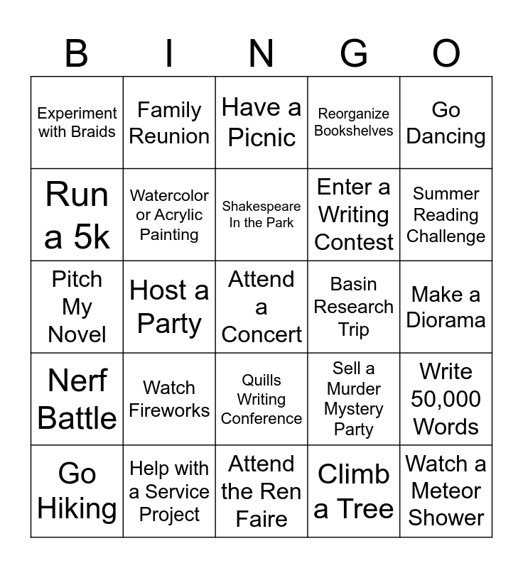 This bingo card has 25 words: Watch Fireworks, Attend the Ren Faire, Shakespeare In the Park, Go Hiking, Go Dancing, Experiment with Braids, Run a 5k, Family Reunion, Basin Research Trip, Quills Writing Conference, Enter a Writing Contest, Pitch My Novel, Sell a Murder Mystery Party, Write 50,000 Words, Watercolor or Acrylic Painting, Watch a Meteor Shower, Make a Diorama, Have a Picnic, Summer Reading Challenge, Host a Party, Attend a Concert, Help with a Service Project, Nerf Battle, Reorganize Bookshelves and Climb a Tree.
