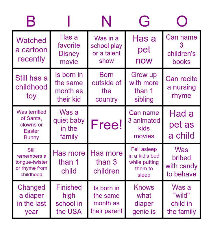 This bingo card has a free space and 24 words: Has more than 1 child, Finished high school in the USA, Born outside of the country, Changed a diaper in the last year, Can name 3 children's books, Watched a cartoon recently, Still has a childhood toy, Has a favorite Disney movie, Can name 3 animated kids movies, Has more than 3 children, Grew up with more than 1 sibling, Was terrified of Santa, clowns or Easter Bunny, Fell asleep in a kid's bed while putting them to sleep, Was bribed with candy to behave, Is born in the same month as their kid, Knows what diaper genie is, Had a pet as a child, Was in a school play or a talent show, Can recite a nursing rhyme, Was a quiet baby in the family, Was a "wild" child in the family, Still remembers a tongue-twister or rhyme from childhood, Has a pet now and Is born in the same month as their parent.