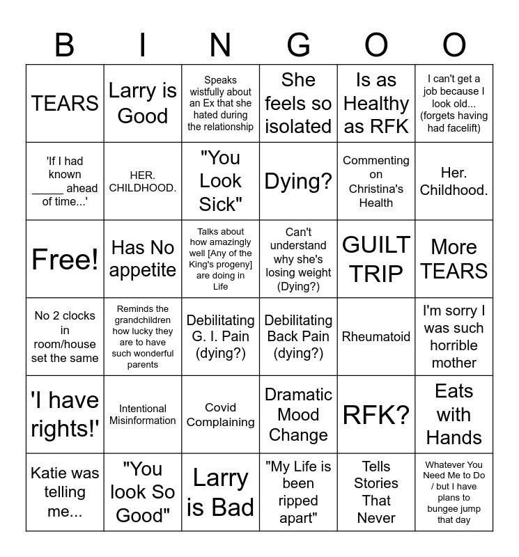 This bingo card has 36 words: Dramatic Mood Change, Covid Complaining, "My Life is been ripped apart", 'If I had known _____ ahead of time...', No 2 clocks in room/house set the same, Can't understand why she's losing weight (Dying?), HER. CHILDHOOD., Larry is Bad, Is as Healthy as RFK, RFK?, Her. Childhood., She feels so isolated, Eats with Hands, Has No appetite, Dying?, TEARS, 'I have rights!', GUILT TRIP, Free!, Speaks wistfully about an Ex that she hated during the relationship, Talks about how amazingly well [Any of the King's progeny] are doing in Life, Reminds the grandchildren how lucky they are to have such wonderful parents, Debilitating Back Pain (dying?), Debilitating G. I. Pain (dying?), Rheumatoid, Larry is Good, Commenting on Christina's Health, "You look So Good", "You Look Sick", I can't get a job because I look old... (forgets having had facelift), Whatever You Need Me to Do / but I have plans to bungee jump that day, Katie was telling me..., I'm sorry I was such horrible mother, More TEARS, Intentional Misinformation and Tells Stories That Never.