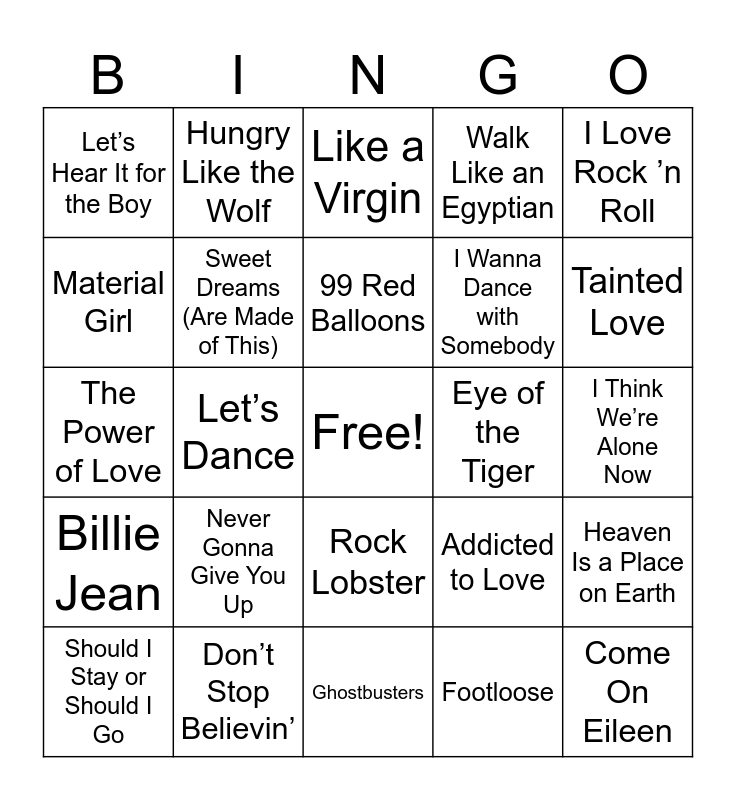 This bingo card has a free space and 60 words: Take On Me, Don’t Stop Believin’, Wake Me Up Before You Go-Go, Billie Jean, Footloose, Girls Just Want to Have Fun, Sweet Dreams (Are Made of This), You Spin Me Round (Like a Record), I Wanna Dance with Somebody, Livin’ on a Prayer, Walk Like an Egyptian, Karma Chameleon, Material Girl, Beat It, Jump, Let’s Hear It for the Boy, Come On Eileen, I Love Rock ’n Roll, Love Shack, 99 Red Balloons, Eye of the Tiger, Like a Virgin, Should I Stay or Should I Go, Heaven Is a Place on Earth, Africa, Our House, Mickey, Everybody Wants to Rule the World, Tainted Love, Faith, Dancing in the Dark, Walking on Sunshine, Time After Time, Don’t You (Forget About Me), Hungry Like the Wolf, The Safety Dance, We Got the Beat, Let’s Dance, She Drives Me Crazy, The Power of Love, Under Pressure, Never Gonna Give You Up, I Think We’re Alone Now, Crazy Little Thing Called Love, Addicted to Love, Every Breath You Take, Take My Breath Away, Manic Monday, I Ran (So Far Away), Rock Lobster, Ghostbusters, Let’s Go Crazy, Another One Bites the Dust, Don’t Dream It’s Over, You Make My Dreams, If I Could Turn Back Time, Push It, Walk This Way, Total Eclipse of the Heart and Jump (For My Love).