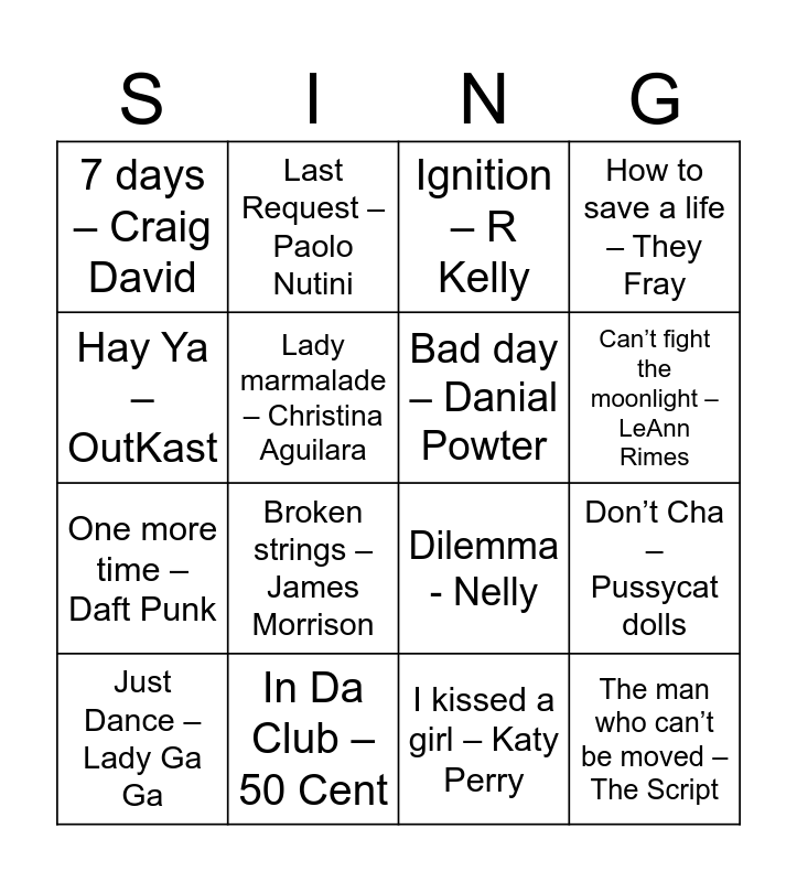 This bingo card has 45 words: American Boy – Estella, Just Dance – Lady Ga Ga, Fireflies - Owl city, Umbrella – Rihanna, Angels – Robbie Williams, Viva La Vida – Coldplay, Ignition – R Kelly, Crazy – Gnarls Barkley, Hay Ya – OutKast, Dancing in the moonlight – Toploader, How to save a life – They Fray, In Da Club – 50 Cent, She will be loved – Maroon 5, Independent Woman – Destiny’s child, It wasn’t me – Shaggy, I’m yours – Jason Mraz, Apologise – Timberland, Dilemma - Nelly, Rule the world – Take That, Broken strings – James Morrison, Last Request – Paolo Nutini, Uptown girl – Westlife, So what – Pink, 7 days – Craig David, Crazy in love – Beyonce, I kissed a girl – Katy Perry, Mr Brightside – The Killers, Rehab – Amy Winehouse, Rock DJ – Robbie Williams, The man who can’t be moved – The Script, Teenage dirtbag – Wheatus, All the small things – Blink 182, Single ladies (put a ring on it) – Beyonce, I gotta feeling – Black eyed peas, Poker face – Lady GaGa, Don’t Cha – Pussycat dolls, She’s so lovely – Scouting for girls, Someone only we know – Keane, Call on me – Eric Prydz, Can’t fight the moonlight – LeAnn Rimes, Lady marmalade – Christina Aguilara, One more time – Daft Punk, Don’t stop moving – S club 7, Bad day – Danial Powter and Back to Black Amy Winhouse.