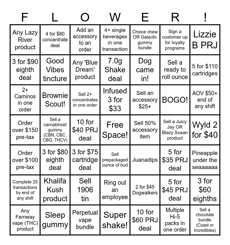 This bingo card has a free space and 48 words: 2 for $45 Dogwalkers, Sell a ready to roll ounce, Super shake!, Sell a cannabinoid gummy (CBN, CBC, CBG, THCV), Sell 2+ concentrates in one order, Wyld 2 for $40, 4 for $80 concentrate deal, Sleep gummy, Sign a customer up for loyalty programs, Sell prepackaged ounce of bud, Lizzie B PRJ, 4+ single beverages in one transaction, BOGO!, Sell an accessory $25+, Complete 25 transactions by end of any shift, Sell a Juicy Jay OR Blazy Susan product, 3 for $90 eighth deal, 5 for $110 cartridges, 5 for $45 PRJ deal, Choice chew OR Galactic gummy bundle, Dog came in!, 10 for $40 PRJ deal, Any Lazy River product, Good Vibes tincture, 3 for $60 eighths, Any 'Blue Dream' product, AOV $50+ end of any shift, Any Fernway vape (THC) product, Infused 3 for $33, Brownie Scout!, Multiple Hi-5 packs in one order, Sell 50% accessory item, Pineapple under the seaaaaaa, Khalifa Kush product, Order over $150 pre-tax, Juanadips, 5 for $35 PRJ deal, 2+ Caminos in one order, 3 for $75 cartridge deal, Sell 1906 tin, Order over $100 pre-tax, Sell a chocolate bundle (Coast or Incredibles), Add an accessory to an order, Perpetual vape bundle, 7.0g Shake deal, Ring out an employee, 3 for $80 eighth deal and 10 for $60 PRJ deal.