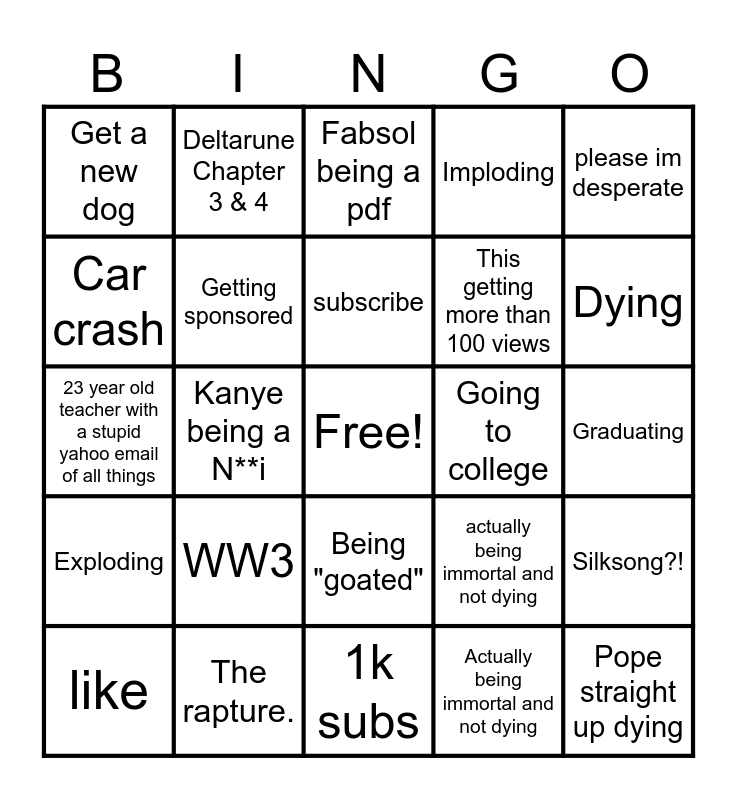This bingo card has a free space and 25 words: WW3, 1k subs, subscribe, like, please im desperate, Get a new dog, Car crash, Deltarune Chapter 3 & 4, Going to college, Being "goated", This getting more than 100 views, 23 year old teacher with a stupid yahoo email of all things, actually being immortal and not dying, Silksong?!, Getting sponsored, Hitting the lottery, Graduating, Fabsol being a pdf, Dying, Kanye being a N**i, Pope straight up dying, The rapture., Exploding, Imploding and Actually being immortal and not dying.