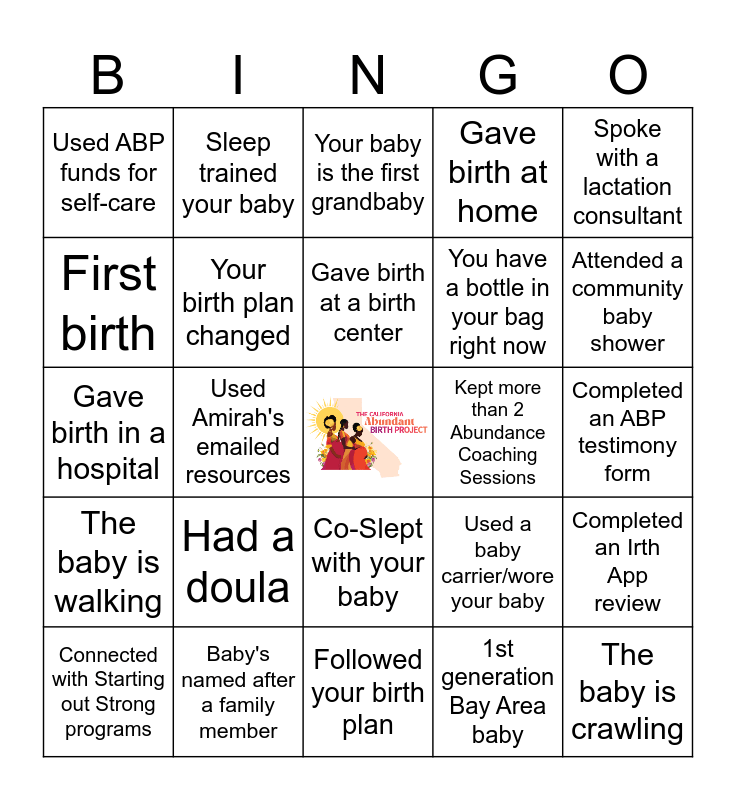This bingo card has a free space and 24 words: Connected with Starting out Strong programs, Had a doula, Gave birth at a birth center, 1st generation Bay Area baby, Spoke with a lactation consultant, Used ABP funds for self-care, Sleep trained your baby, Your baby is the first grandbaby, Kept more than 2 Abundance Coaching Sessions, Completed an ABP testimony form, Gave birth in a hospital, Your birth plan changed, Used a baby carrier/wore your baby, Completed an Irth App review, First birth, Baby's named after a family member, Followed your birth plan, Gave birth at home, Attended a community baby shower, The baby is walking, Used Amirah's emailed resources, Co-Slept with your baby, You have a bottle in your bag right now and The baby is crawling.