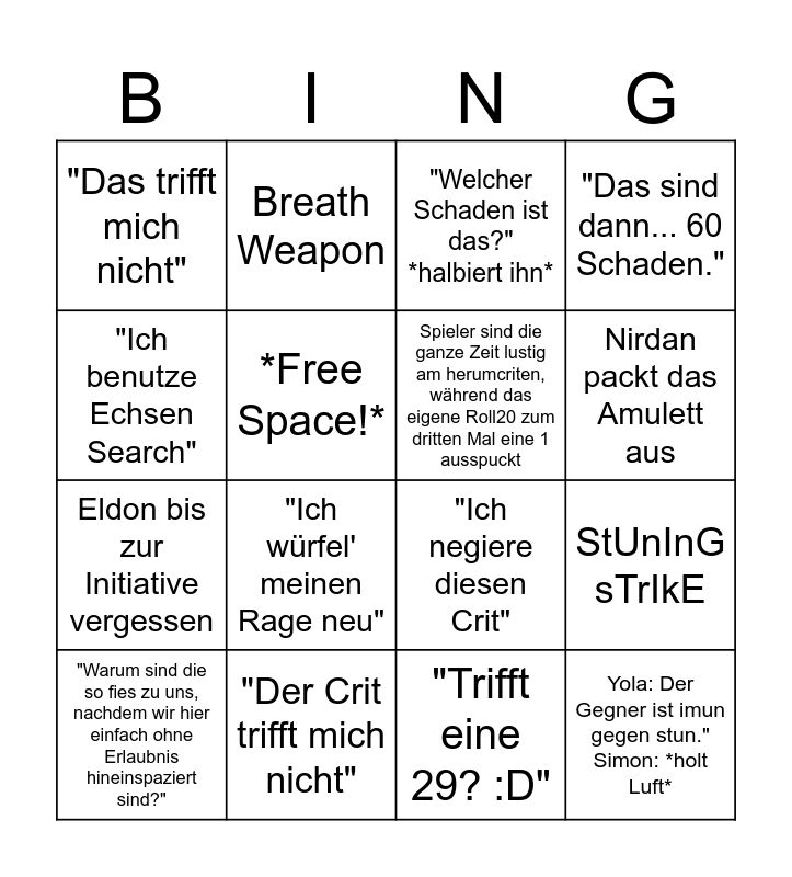 This bingo card has 16 words: "Der Crit trifft mich nicht", StUnInG sTrIkE, "Welcher Schaden ist das?" *halbiert ihn*, "Das trifft mich nicht", Eldon bis zur Initiative vergessen, Breath Weapon, "Ich negiere diesen Crit", "Trifft eine 29? :D", "Ich benutze Echsen Search", *Free Space!*, "Warum sind die so fies zu uns, nachdem wir hier einfach ohne Erlaubnis hineinspaziert sind?", "Das sind dann... 60 Schaden.", "Ich würfel' meinen Rage neu", Nirdan packt das Amulett aus, Spieler sind die ganze Zeit lustig am herumcriten, während das eigene Roll20 zum dritten Mal eine 1 ausspuckt and Yola: Der Gegner ist imun gegen stun." Simon: *holt Luft*.