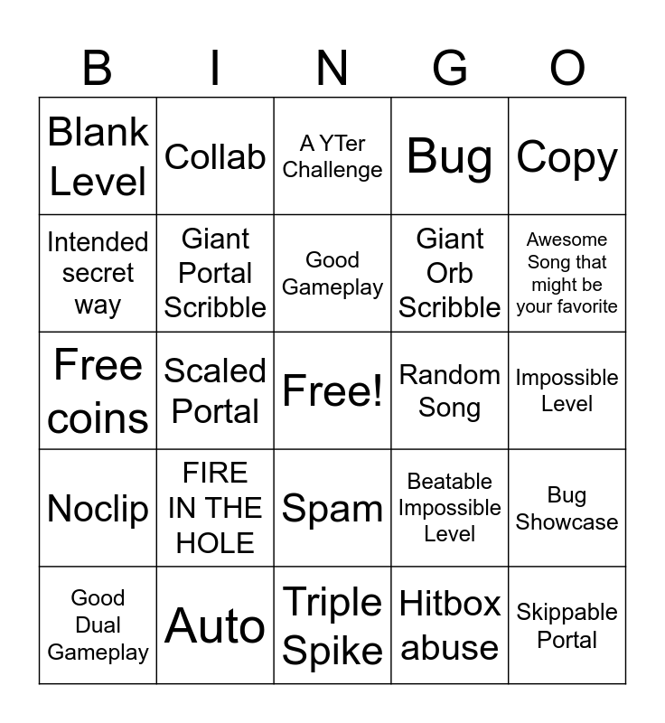 This bingo card has a free space and 24 words: FIRE IN THE HOLE, Auto, Good Gameplay, Good Dual Gameplay, Copy, Blank Level, Intended secret way, Collab, Random Song, Spam, Giant Orb Scribble, Free coins, Beatable Impossible Level, Bug Showcase, Giant Portal Scribble, Hitbox abuse, Impossible Level, A YTer Challenge, Awesome Song that might be your favorite, Scaled Portal, Skippable Portal, Noclip, Bug and Triple Spike.