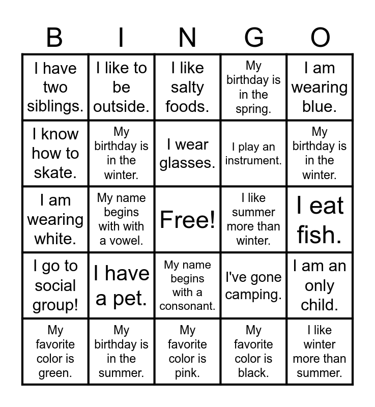 This bingo card has a free space and 24 words: I have a pet., My birthday is in the summer., I wear glasses., My favorite color is green., I am wearing blue., I have two siblings., I know how to skate., I like to be outside., I like summer more than winter., My name begins with a consonant., I play an instrument., I am wearing white., I've gone camping., I am an only child., My birthday is in the winter., My favorite color is black., I eat fish., I like salty foods., My birthday is in the winter., My name begins with with a vowel., I like winter more than summer., I go to social group!, My birthday is in the spring. and My favorite color is pink..
