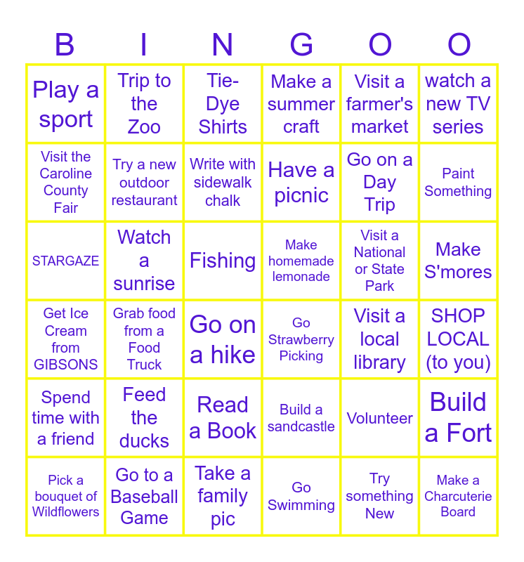 This bingo card has 36 words: Build a sandcastle, Read a Book, Go Swimming, Visit the Caroline County Fair, Get Ice Cream from GIBSONS, Make homemade lemonade, Try a new outdoor restaurant, Take a family pic, Visit a farmer's market, Volunteer, Paint Something, Make a summer craft, Build a Fort, Watch a sunrise, Have a picnic, Play a sport, Spend time with a friend, Visit a National or State Park, STARGAZE, Tie-Dye Shirts, Fishing, Grab food from a Food Truck, Go Strawberry Picking, Go on a hike, Visit a local library, Trip to the Zoo, Go on a Day Trip, Go to a Baseball Game, Write with sidewalk chalk, watch a new TV series, Make a Charcuterie Board, Pick a bouquet of Wildflowers, SHOP LOCAL (to you), Make S'mores, Feed the ducks and Try something New.