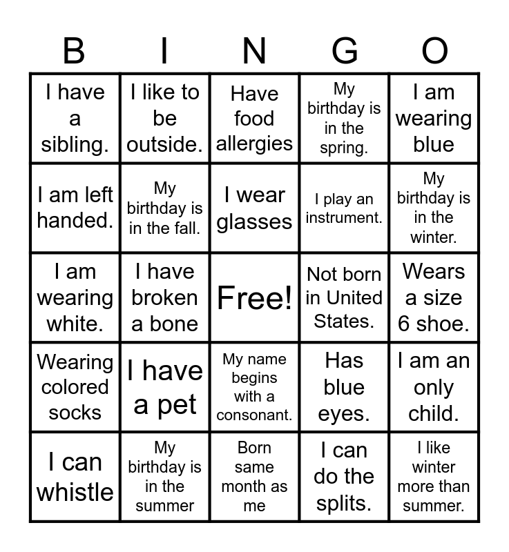 This bingo card has a free space and 24 words: I have a pet, My birthday is in the summer, I wear glasses, I can whistle, I am wearing blue, I have a sibling., I am left handed., I like to be outside., Not born in United States., My name begins with a consonant., I play an instrument., I am wearing white., Has blue eyes., I am an only child., My birthday is in the fall., I can do the splits., Wears a size 6 shoe., Have food allergies, My birthday is in the winter., I have broken a bone, I like winter more than summer., Wearing colored socks, My birthday is in the spring. and Born same month as me.