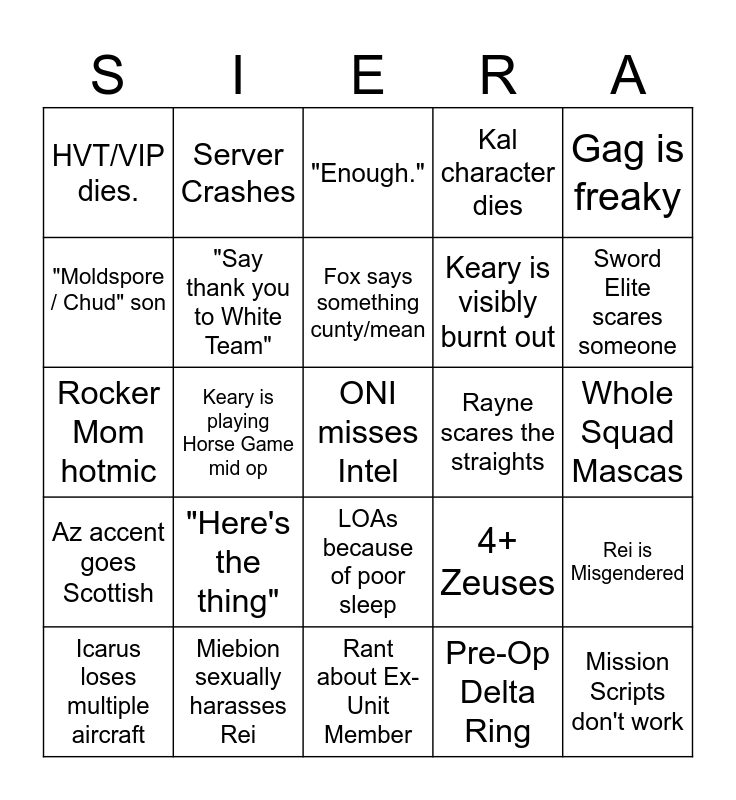 This bingo card has a free space and 24 words: "Here's the thing", Miebion sexually harasses Rei, Fox says something cunty/mean, Icarus loses multiple aircraft, Gag is freaky, HVT/VIP dies., "Moldspore / Chud" son, Server Crashes, Rayne scares the straights, LOAs because of poor sleep, Keary is visibly burnt out, Rocker Mom hotmic, 4+ Zeuses, Rei is Misgendered, "Say thank you to White Team", Pre-Op Delta Ring, Whole Squad Mascas, "Enough.", Sword Elite scares someone, Keary is playing Horse Game mid op, Mission Scripts don't work, Az accent goes Scottish, Kal character dies and Rant about Ex-Unit Member.