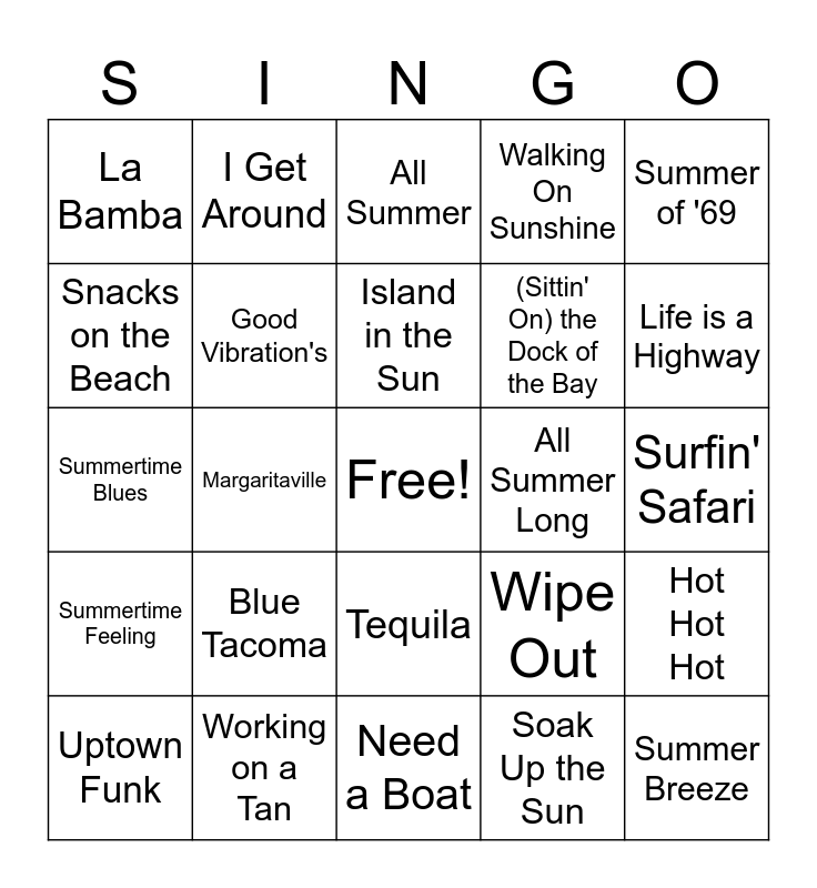 This bingo card has a free space and 44 words: Kokomo, Summer Breeze, Anything Goes, Uptown Funk, Steal My Sunshine, Soak Up the Sun, All Summer, Sunrise, Sunburn, Sunset, Summer of '69, Working on a Tan, Walking On Sunshine, All Summer Long, Tequila, Blue Tacoma, Cake by the Ocean, Need a Boat, Sun Daze, Summertime Blues, Sun Ain't Even Gone Down Yet, Life is a Highway, I Get Around, Summer Girls, Watermelon Sugar, La Bamba, Summer in the City, Surfin' Safari, In the Summertime, Feels Like Summer, Wipe Out, Summertime Feeling, Heat Waves, Hot Hot Hot, Sunny Day, Surfin' Bird, Margaritaville, Joy to the World, Over the Rainbow, Three Little Birds, Island in the Sun, Snacks on the Beach, (Sittin' On) the Dock of the Bay, Drift Away, Good Vibration's and Surfin' Safari.