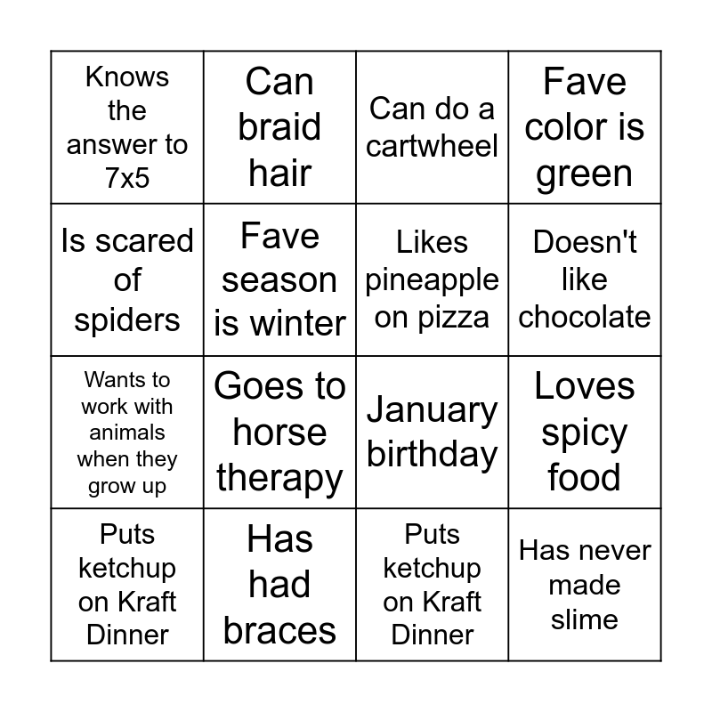 This bingo card has 16 words: Has had braces, Loves spicy food, Can do a cartwheel, Knows the answer to 7x5, Wants to work with animals when they grow up, Can braid hair, January birthday, Puts ketchup on Kraft Dinner, Is scared of spiders, Fave season is winter, Puts ketchup on Kraft Dinner, Fave color is green, Goes to horse therapy, Doesn't like chocolate, Likes pineapple on pizza and Has never made slime.