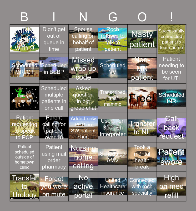 This bingo card has 31 images and 36 words: Scheduled AMV, Nursing home calling, United Healthcare insurance, Scheduled MRI/CT, Patient requesting to speak to PCP, Transcribed labs/ mammo, Scheduled in BEBP, No active portal, Nasty patient, Took a mental health break, Patient needing to be seen for UTI, Roch refuses to talk to patient, Patient swore, Scheduled multiple patients in one call, Scheduled VV, MRN starting with 9, Patient scheduled outside of hometown clinic, Free!, Updated demographics, Spouse calling on behalf of patient, Asked question in big group chat, Parent calling for patient over 18, Used non Spanish interpreter, Added new PCP on SW patient chart, Transfer to NL, Didn't get out of queue in time, Non-MN patient, Forgot you were on mute, Missed wrap up code, Successfully connected patient to team nurse, High pri med refill, Transfer to Urology, Call back request, Scheduled INR, Patient using mail order pharmacy and Connected with roch specialty.