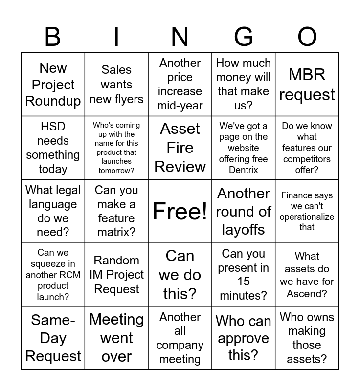 This bingo card has a free space and 24 words: Random IM Project Request, Meeting went over, Asset Fire Review, Same-Day Request, MBR request, New Project Roundup, HSD needs something today, Sales wants new flyers, Another round of layoffs, Can we do this?, We've got a page on the website offering free Dentrix, What legal language do we need?, Can you present in 15 minutes?, What assets do we have for Ascend?, Who's coming up with the name for this product that launches tomorrow?, Who can approve this?, Finance says we can't operationalize that, Another price increase mid-year, Do we know what features our competitors offer?, Can you make a feature matrix?, Who owns making those assets?, Can we squeeze in another RCM product launch?, How much money will that make us? and Another all company meeting.