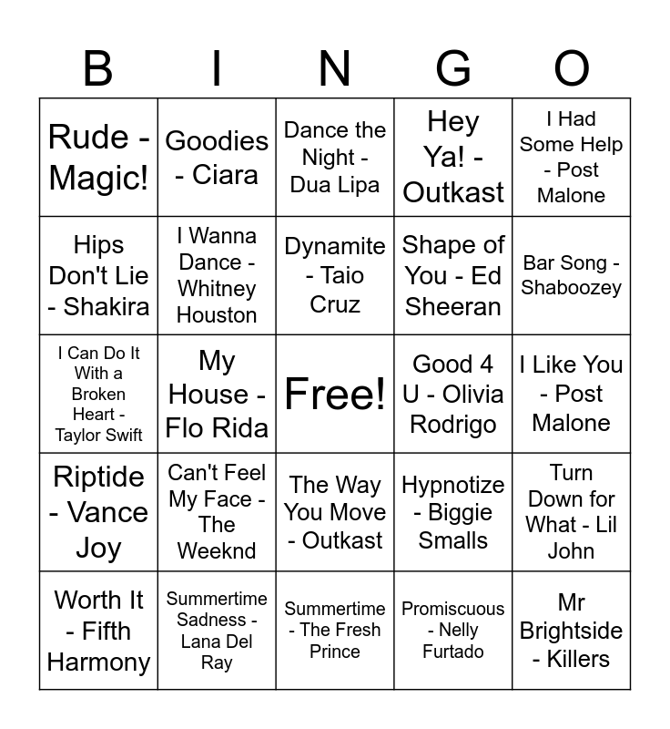 This bingo card has a free space and 40 words: Espresso - Sabrina Carpenter, I Can Do It With a Broken Heart - Taylor Swift, Flowers - Miley Cyrus, I Wanna Dance - Whitney Houston, Summertime Sadness - Lana Del Ray, The Way You Move - Outkast, Dynamite - Taio Cruz, Stay - Justin Bieber, I Had Some Help - Post Malone, Riptide - Vance Joy, My House - Flo Rida, Hey Ya! - Outkast, Mr Brightside - Killers, I Like You - Post Malone, Good 4 U - Olivia Rodrigo, Can't Feel My Face - The Weeknd, Don't Let Me Down - Chainsmokers, Rude - Magic!, Tik Tok - Ke$ha, Dance the Night - Dua Lipa, Turn Down for What - Lil John, Promiscuous - Nelly Furtado, Shape of You - Ed Sheeran, Hips Don't Lie - Shakira, I Kissed a Girl - Katy Perry, Can't Hold Us - Macklemore, That's What I Like - Bruno Mars, Call Me Maybe - Carly Rae Jepsen, Cheap Thrills - Sia, Closer - Chainsmokers, Superbass - Nicki Minaj, Worth It - Fifth Harmony, The Sign - Ace of Base, Hypnotize - Biggie Smalls, Bar Song - Shaboozey, Summertime - The Fresh Prince, Bartender - T-Pain, Umbrella - Rhianna, Goodies - Ciara and California Love - Tupac.