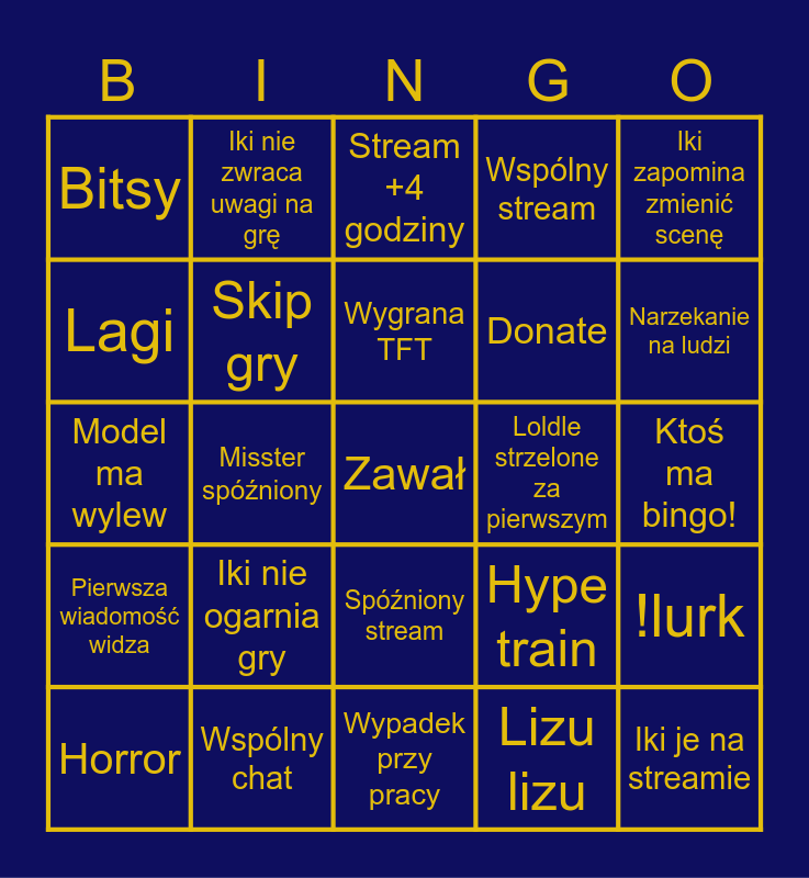 This bingo card has 51 words: Wylew, Zawał, Woda!, Wypadek przy pracy, Iki nie ogarnia gry, Iki ssie w grze, Iki nie zwraca uwagi na grę, Inny streamer na chacie, Lagi, TTS, Skip gry, Wspólny stream, !lurk, Hype train, Problemy techniczne, Przegrana TFT, Wygrana TFT, Loldle strzelone za pierwszym, Stopcham, Iki zapomina zmienić scenę, Misster spóźniony, Lizu lizu, Bitsy, Donate, Subskrypcja, Iki je na streamie, Narzekanie na ludzi, Gra z moderatorem, Horror, Stream +4 godziny, Raid, TFT, LoL, !sr, disco polo na !sr, Wspólny chat, Rage, OiiaOiia, Iki pali!!!, Iki jest zła na widzów, Ktoś ma bingo!, Pierwsza wiadomość widza, Sytuacja w pracy, Dźwięk za bitsy, Afk, Obserwacja!, Model ma wylew, !sr powyżej godziny, Stream wcześniej niż zaplanowano, Spóźniony stream and Karaoke.