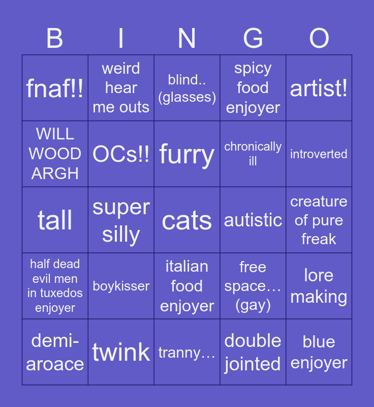 This bingo card has 25 words: boykisser, tranny…, furry, demi-aroace, artist!, fnaf!!, WILL WOOD ARGH, weird hear me outs, autistic, italian food enjoyer, chronically ill, tall, free space…(gay), lore making, OCs!!, blue enjoyer, creature of pure freak, blind..(glasses), introverted, super silly, cats, twink, half dead evil men in tuxedos enjoyer, spicy food enjoyer and double jointed.