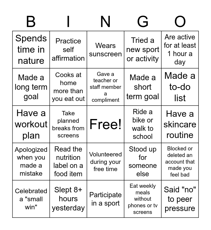 This bingo card has a free space and 30 words: Slept 8+ hours yesterday, Regularly brush & floss teeth, Take planned breaks from screens, Takes the stairs instead of the elevator, Spends time in nature, Wears sunscreen, Cooks at home more than you eat out, Volunteered during your free time, Ride a bike or walk to school, Participate in a sport, Have a skincare routine, Said "no" to peer pressure, Eat weekly meals without phones or tv screens, Drink more water than other liquids, Made a to-do list, Got straight A's in school, Stood up for someone else, Apologized when you made a mistake, Read the nutrition label on a food item, Are active for at least 1 hour a day, Have a workout plan, Went a whole day without junk food, Practice self affirmation, Made a short term goal, Made a long term goal, Tried a new sport or activity, Blocked or deleted an account that made you feel bad, Celebrated a "small win", Gave a teacher or staff member a compliment and Offered help without being asked.