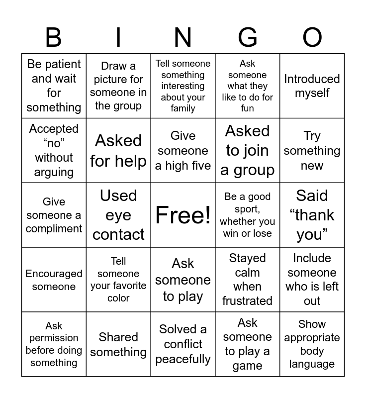 This bingo card has a free space and 24 words: Tell someone your favorite color, Shared something, Give someone a high five, Ask permission before doing something, Introduced myself, Be patient and wait for something, Accepted “no” without arguing, Draw a picture for someone in the group, Be a good sport, whether you win or lose, Ask someone to play, Asked to join a group, Give someone a compliment, Stayed calm when frustrated, Include someone who is left out, Asked for help, Ask someone to play a game, Said “thank you”, Tell someone something interesting about your family, Try something new, Used eye contact, Show appropriate body language, Encouraged someone, Ask someone what they like to do for fun and Solved a conflict peacefully.