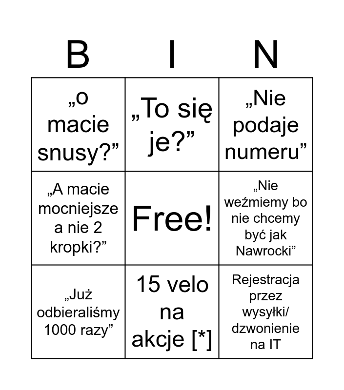 This bingo card has a free space and 8 words: „Nie weźmiemy bo nie chcemy być jak Nawrocki”, „Nie podaje numeru”, „To się je?”, „Już odbieraliśmy 1000 razy”, „o macie snusy?”, Rejestracja przez wysyłki/ dzwonienie na IT, „A macie mocniejsze a nie 2 kropki?” and 15 velo na akcje [*].