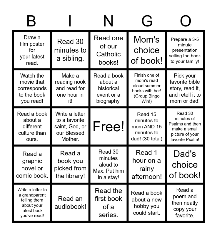 This bingo card has a free space and 25 words: Read a book you picked from the library!, Read the first book of a series., Read a book about a historical event or a biography., Write a letter to a grandparent telling them about your latest book you've read!, Prepare a 3-5 minute presentation selling the book to your family!, Draw a film poster for your latest read., Watch the movie that corresponds to the book you read!, Read 30 minutes to a sibling., Read 15 minutes to mom AND 15 minutes to dad! (30 total), Read 30 minutes aloud to Max. Put him in a stay!, Finish one of mom's read aloud summer books with her! (Group Bingo Win!), Read a book about a different culture than ours., Read 1 hour on a rainy afternoon!, Dad's choice of book!, Make a reading nook and read for one hour in it!, Read a Gospel- Matthew, Mark, Luke, or John, Read 30 minutes of Psalms and then make a small picture of your favorite Psalm!, Read one of our Catholic books!, Pick your favorite bible story, read it, and retell it to mom or dad!, Write a letter to a favorite saint, God, or our Blessed Mother., Read a poem and then neatly copy your favorite., Read an audiobook!, Read a graphic novel or comic book., Mom's choice of book! and Read a book about a new hobby you could start..