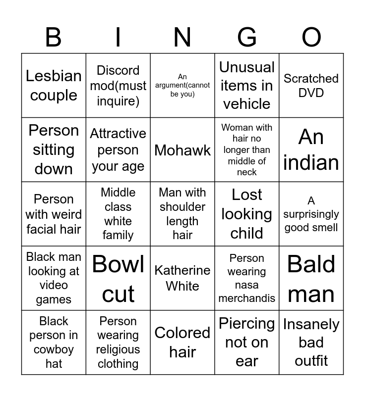 This bingo card has a free space and 24 words: Bowl cut, Person wearing religious clothing, Mohawk, Black person in cowboy hat, Scratched DVD, Lesbian couple, Person sitting down, Discord mod(must inquire), Lost looking child, Katherine White, Woman with hair no longer than middle of neck, Person with weird facial hair, Person wearing nasa merchandis, Bald man, Attractive person your age, Piercing not on ear, A surprisingly good smell, An argument(cannot be you), An indian, Middle class white family, Insanely bad outfit, Black man looking at video games, Unusual items in vehicle and Colored hair.