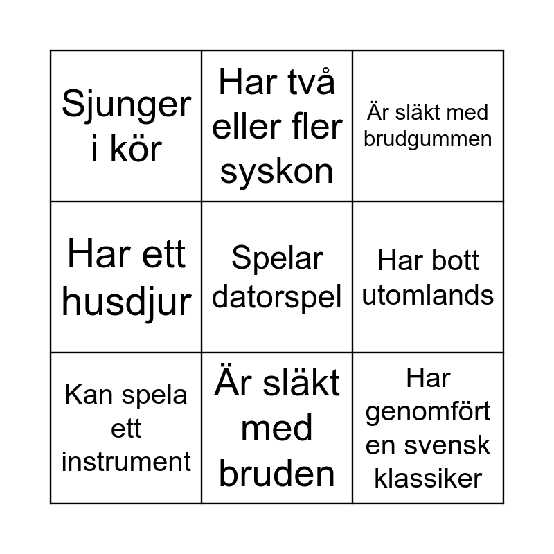 This bingo card has a free space and 8 words: Har bott utomlands, Är släkt med brudgummen, Har två eller fler syskon, Kan spela ett instrument, Sjunger i kör, Har genomfört en svensk klassiker, Har ett husdjur and Är släkt med bruden.