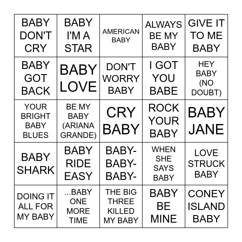 This bingo card has 60 words: BABY, ...BABY ONE MORE TIME, BABE, BABY SHARK, BABY BE MINE, BABY BOY, BABY LOVE, BABY, I LOVE YOUR WAY, I GOT YOU BABE, BABY, BABY, ALWAYS BE MY BABY, BE MY BABY (THE RONETTES), BABY GOT BACK, ICE ICE BABY, BABY HOLD ON, BABY DON'T CRY, CRY BABY, GIVE IT TO ME BABY, RUNAWAY BABY, DON'T WORRY BABY, ROCK YOUR BABY, AMERICAN BABY, DOING IT ALL FOR MY BABY, LOVE STRUCK BABY, TROUBLE WITH MY BABY, NOBODY PUTS BABY IN THE CORNER, HEY! BABY (BRUCE CHANNEL), BORN TO BE MY BABY, HEY BABY (NO DOUBT), SUGAR BABY LOVE, SOMEONE ELSE CALLING YOU BABY, PLUG IN BABY, BABY COME ON WITH IT, MONA (I NEED YOU BABY), BABY I'M A STAR, BABY DON'T FORGET MY NUMBER, I'M YOUR BABY TONIGHT, BE MY BABY (ARIANA GRANDE), BABY GRAND, YOUR BRIGHT BABY BLUES, HEY BABY (DROP IT TO THE FLOOR), BABY RIDE EASY, BABY JANE, BABY I NEED YOUR LOVING, WHEN SHE SAYS BABY, BABY BE SIMPLE, THERE GOES MY BABY (USHER), STAR BABY, THERE GOES MY BABY (CHARLIE WILSON), BABY-BABY-BABY-, THE BIG THREE KILLED MY BABY, BABY DON'T GO, WEREWOLF, BABY!, BABY DID A BAD THING, LOVE TO LOVE YOU BABY, BABY, PLEASE DON'T GO, C'MON BABY, CRY, BABY BLUE, CONEY ISLAND BABY and I'M GONNA LOVE YOU JUST A LITTLE MORE BABY.