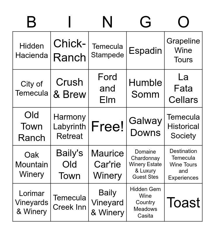 This bingo card has a free space and 47 words: 1909, Toast, A Grape Escape Balloon Adventure, Baily Vineyard & Winery, Baily's Old Town, California Ranch Company (CRC), Chick-Ranch, Chubby Cheeks Meadery, City of Temecula, Coffee Til Cocktails Boutique, Crush & Brew, Espadin, Destination Temecula Wine Tours and Experiences, Domaine Chardonnay Winery Estate & Luxury Guest Stes, Europa Village, Executive VIP Shuttle, Ford and Elm, Galway Downs, Gold Crown Farms, Grapeline Wine Tours, Harmony Labyrinth Retreat, Hidden Gem Wine Country Meadows Casita, Hidden Hacienda, Humble Somm, Inn at Churon Winery, La Fata Cellars, Lorimar Vineyards & Winery, Lorimar Café, Maurice Car'rie Winery, Oak Mountain Winery, Old Town Spice & Tea Merchants, Oscar's Brewing Company, Portals Entertainment Center, Rusty Fork Ranch, South Coast Winery Resort & Spa, Temecula Creek Inn, Temecula Historical Society, Temecula Lavender Co., Temecula Life, Temecula Olive Oil Company, Temecula Picnic & Proposals Co., Temecula Stampede, Old Town Ranch, Temecula Valley Chamber of Commerce, The Haunt Ghost Tours, Tiki Burger and Wilson Creek Winery.