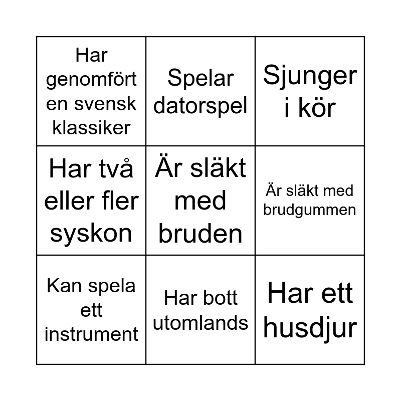 This bingo card has a free space and 8 words: Är släkt med brudgummen, Sjunger i kör, Spelar datorspel, Kan spela ett instrument, Har genomfört en svensk klassiker, Har ett husdjur, Har två eller fler syskon and Har bott utomlands.