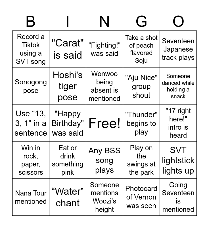 This bingo card has a free space and 24 words: Eat or drink something pink, “Water” chant, Wonwoo being absent is mentioned, Nana Tour mentioned, Seventeen Japanese track plays, Record a Tiktok using a SVT song, Sonogong pose, "Carat" is said, "Thunder" begins to play, Any BSS song plays, "Aju Nice" group shout, Use “13, 3, 1” in a sentence, Play on the swings at the park, SVT lightstick lights up, Hoshi's tiger pose, Photocard of Vernon was seen, "17 right here!" intro is heard, "Fighting!" was said, Someone danced while holding a snack, "Happy Birthday" was said, Going Seventeen is mentioned, Win in rock, paper, scissors, Take a shot of peach flavored Soju and Someone mentions Woozi’s height.
