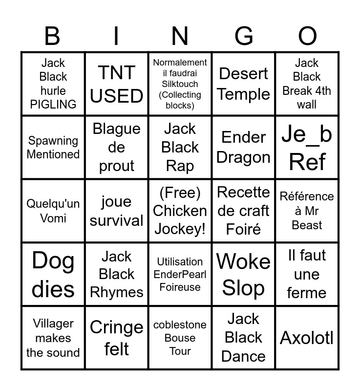 This bingo card has a free space and 24 words: Villager makes the sound, Jack Black Rhymes, Jack Black Rap, Jack Black Dance, Jack Black Break 4th wall, Jack Black hurle PIGLING, TNT USED, Normalement il faudrai Silktouch (Collecting blocks), Recette de craft Foiré, Référence à Mr Beast, Quelqu'un Vomi, Blague de prout, Woke Slop, Il faut une ferme, Spawning Mentioned, Cringe felt, coblestone Bouse Tour, Desert Temple, Je_b Ref, Dog dies, joue survival, Utilisation EnderPearl Foireuse, Ender Dragon and Axolotl.