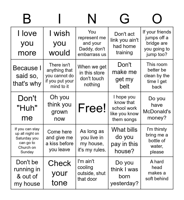 This bingo card has a free space and 36 words: Close that refrigerator door, Go find your Daddy, Stop that crying before I give you something to cry about, There isn't anything that you cannot do if you put your mind to it, What bills do you pay in this house?, If you can stay up all night on Saturday you can go to Church on Sunday, When we get in this store don't touch nothing, No Today, If your friends jumps off a bridge are you going to jump too?, Did you drink the last cold soda I had in the fridge?, Oh you think you grown now, Don't act link you ain't had home training, Get out of my purse, I hope you know that school work like you know them songs, This room better be clean by the time I get back, I love you more, Oh you think thats funny, Come here and give me a kiss before you leave, A hard head makes a soft behind, You represent me and your Daddy, don't embarrass us, Do you have McDonald's money?, I'm thirsty bring me a bottle of water, please, Check your tone, Don't be running in & out of my house, I'm ain't cooling outside, shut that door, I wish you would, Don't "Huh" me, Money don't grow on trees, Don't make me get my belt, Because I said so, that's why, Who do you think you talking to?, I don't care who started it, YOU stop it., Do you think I was born yesterday?, As long as you live in my house, it's my rules., I don't have to explain myself, I said no. and Fix your face before I fix it for you!.