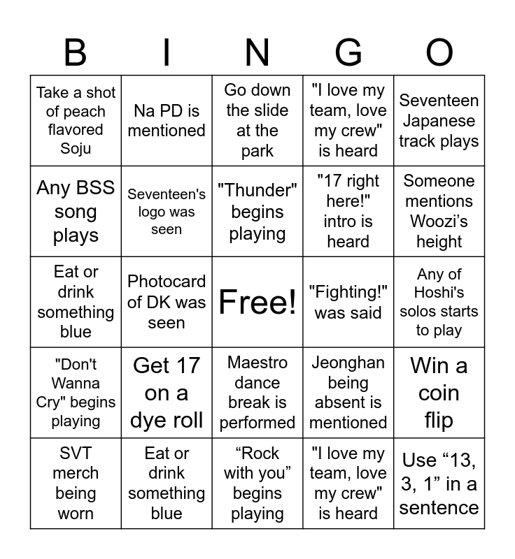 This bingo card has a free space and 24 words: Get 17 on a dye roll, Eat or drink something blue, "Thunder" begins playing, SVT merch being worn, Seventeen Japanese track plays, Take a shot of peach flavored Soju, Any BSS song plays, Na PD is mentioned, "Fighting!" was said, Maestro dance break is performed, "17 right here!" intro is heard, Eat or drink something blue, Jeonghan being absent is mentioned, Win a coin flip, Seventeen's logo was seen, "I love my team, love my crew" is heard, Any of Hoshi's solos starts to play, Go down the slide at the park, Someone mentions Woozi’s height, Photocard of DK was seen, Use “13, 3, 1” in a sentence, "Don't Wanna Cry" begins playing, "I love my team, love my crew" is heard and “Rock with you” begins playing.