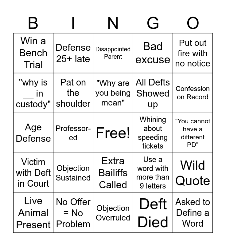 This bingo card has a free space and 46 words: Wild Shoes, Asked to Define a Word, "Blue Outfit", Objection Overruled, Objection Sustained, Defense Early, Defense 25+ late, Handle A Felony Hearing, "why is __ in custody", Are you sure, Pat on the shoulder, Bad excuse, Wild Quote, Use a word with more than 9 letters, Latin on Record, Win a Prelim, "Why are you being mean", Whining about speeding tickets, Win with no prep, Put out fire with no notice, Professor-ed, Deft Died, Win a Bench Trial, All Defts Showed up, Wild Quote from Deft., Confession on Record, Live Animal Present, Medic Called, Extra Bailiffs Called, Victim with Deft in Court, Assigned AWOL, "Who TF Made This Offer", 5+ Assigned on Case, 3+ Prior Defense Attys, Set for Plea or Trial no offer, No Offer = No Problem, "You cannot have a different PD", Bailiff Warns APA about deft, 552 or meth, Drug Test Positive, Drug Test Negative, Disappointed Parent, Age Defense, SIS on CDL, Pulled Case Law From Thin Air and Kittens.