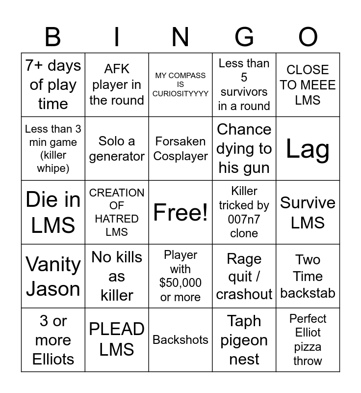 This bingo card has a free space and 24 words: 3 or more Elliots, No kills as killer, Forsaken Cosplayer, Taph pigeon nest, CLOSE TO MEEE LMS, 7+ days of play time, AFK player in the round, MY COMPASS IS CURIOSITYYYY, Killer tricked by 007n7 clone, Survive LMS, Die in LMS, Solo a generator, Rage quit / crashout, Two Time backstab, Less than 3 min game (killer whipe), PLEAD LMS, Backshots, Less than 5 survivors in a round, Lag, Vanity Jason, CREATION OF HATRED LMS, Player with $50,000 or more, Chance dying to his gun and Perfect Elliot pizza throw.