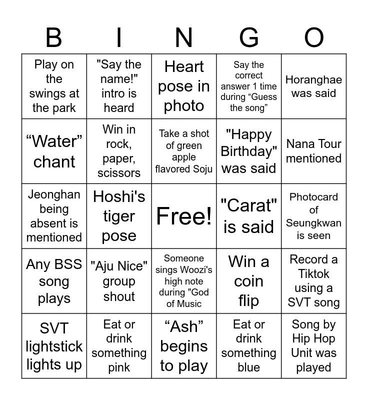 This bingo card has a free space and 24 words: "Aju Nice" group shout, Eat or drink something pink, Take a shot of green apple flavored Soju, SVT lightstick lights up, Horanghae was said, Play on the swings at the park, “Water” chant, "Say the name!" intro is heard, "Carat" is said, Someone sings Woozi's high note during "God of Music, "Happy Birthday" was said, Jeonghan being absent is mentioned, Win a coin flip, Record a Tiktok using a SVT song, Win in rock, paper, scissors, Eat or drink something blue, Photocard of Seungkwan is seen, Heart pose in photo, Nana Tour mentioned, Hoshi's tiger pose, Song by Hip Hop Unit was played, Any BSS song plays, Say the correct answer 1 time during “Guess the song” and “Ash” begins to play.