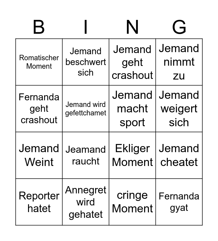 This bingo card has 16 words: Annegret wird gehatet, Jemand cheatet, Jemand geht crashout, Romatischer Moment, Jemand Weint, Jemand beschwert sich, Ekliger Moment, cringe Moment, Fernanda geht crashout, Jemand wird gefettchamet, Reporter hatet, Jemand nimmt zu, Jeamand raucht, Jemand weigert sich, Jemand macht sport and Fernanda gyat.