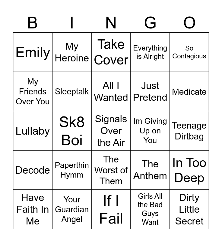 This bingo card has a free space and 24 words: Paperthin Hymm, Your Guardian Angel, All I Wanted, Have Faith In Me, So Contagious, Emily, My Friends Over You, My Heroine, Im Giving Up on You, The Worst of Them, Just Pretend, Lullaby, The Anthem, In Too Deep, Sleeptalk, Girls All the Bad Guys Want, Teenage Dirtbag, Take Cover, Medicate, Sk8 Boi, Dirty Little Secret, Decode, Everything is Alright and If I Fail.