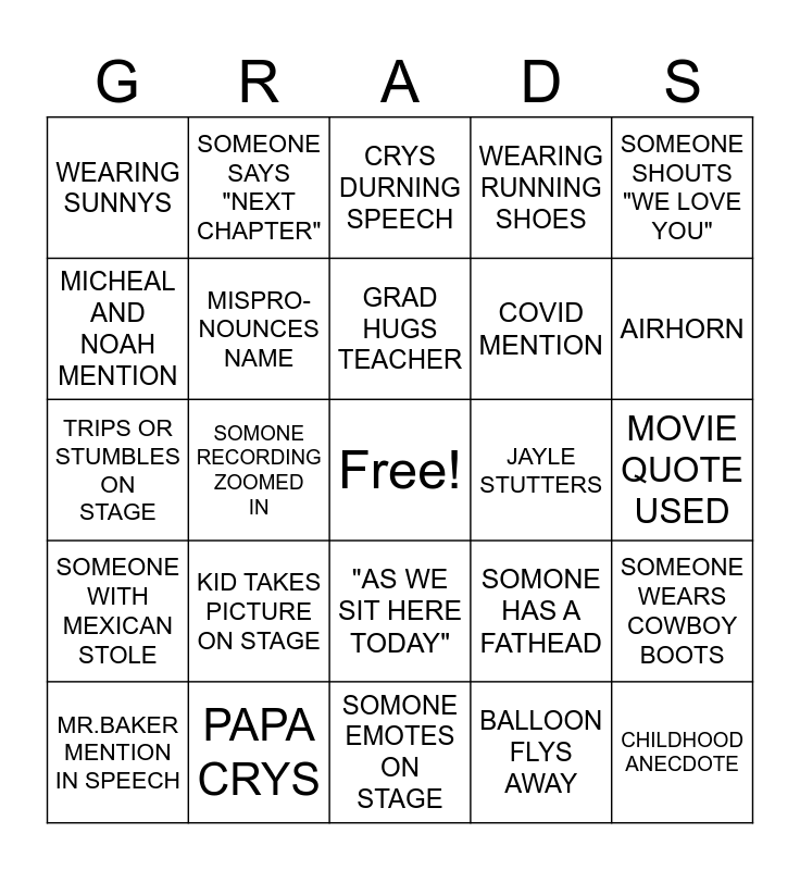 This bingo card has a free space and 24 words: MR.BAKER MENTION IN SPEECH, KID TAKES PICTURE ON STAGE, GRAD HUGS TEACHER, BALLOON FLYS AWAY, SOMEONE SHOUTS "WE LOVE YOU", WEARING SUNNYS, SOMEONE SAYS "NEXT CHAPTER", CRYS DURNING SPEECH, JAYLE STUTTERS, MOVIE QUOTE USED, TRIPS OR STUMBLES ON STAGE, MISPRO-NOUNCES NAME, SOMONE HAS A FATHEAD, SOMEONE WEARS COWBOY BOOTS, MICHEAL AND NOAH MENTION, PAPA CRYS, SOMONE EMOTES ON STAGE, WEARING RUNNING SHOES, AIRHORN, SOMEONE WITH MEXICAN STOLE, SOMONE RECORDING ZOOMED IN, "AS WE SIT HERE TODAY", COVID MENTION and CHILDHOOD ANECDOTE.