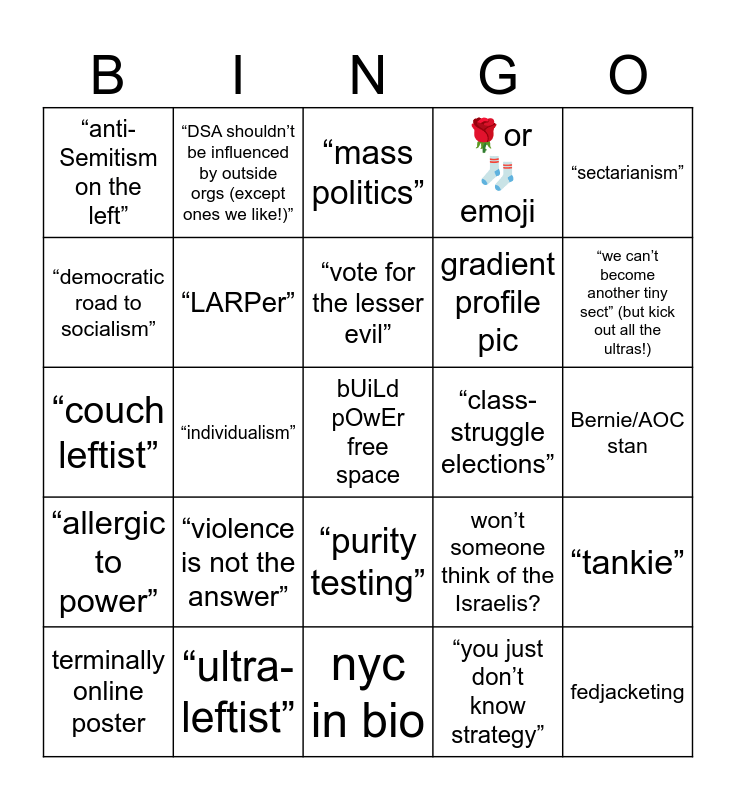 This bingo card has a free space and 24 words: terminally online poster, “violence is not the answer”, “vote for the lesser evil”, “you just don’t know strategy”, “sectarianism”, “anti-Semitism on the left”, “DSA shouldn’t be influenced by outside orgs (except ones we like!)”, “mass politics”, “class-struggle elections”, Bernie/AOC stan, “couch leftist”, “LARPer”, won’t someone think of the Israelis?, “tankie”, “democratic road to socialism”, “ultra-leftist”, nyc in bio, 🌹or 🧦 emoji, “we can’t become another tiny sect” (but kick out all the ultras!), “allergic to power”, “individualism”, “purity testing”, gradient profile pic and fedjacketing.