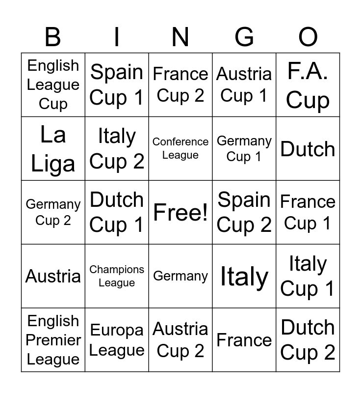 This bingo card has a free space and 24 words: Champions League, Europa League, Conference League, English Premier League, F.A. Cup, English League Cup, La Liga, Spain Cup 1, Spain Cup 2, Germany, Germany Cup 1, Germany Cup 2, Italy, Italy Cup 1, Italy Cup 2, France, France Cup 1, France Cup 2, Dutch, Dutch Cup 1, Dutch Cup 2, Austria, Austria Cup 1 and Austria Cup 2.