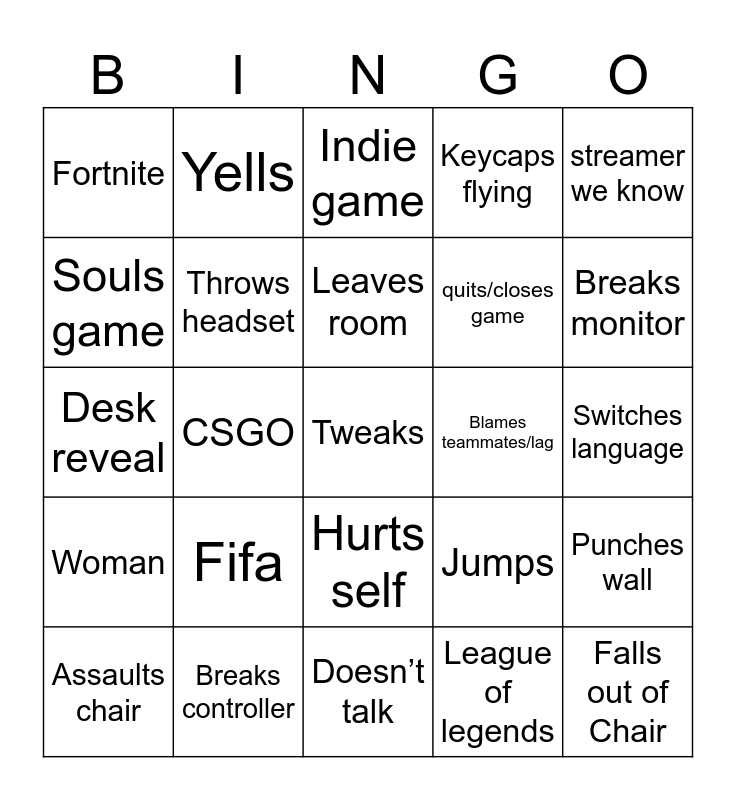 This bingo card has a free space and 24 words: Fifa, Breaks controller, Leaves room, Assaults chair, streamer we know, Fortnite, Souls game, Yells, Blames teammates/lag, Hurts self, quits/closes game, Desk reveal, Jumps, Punches wall, Throws headset, League of legends, Switches language, Indie game, Breaks monitor, CSGO, Falls out of Chair, Woman, Keycaps flying and Doesn’t talk.