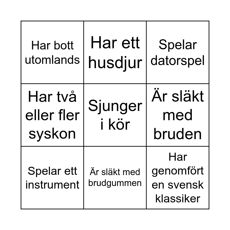 This bingo card has 9 words: Spelar ett instrument, Spelar datorspel, Har ett husdjur, Har två eller fler syskon, Har bott utomlands, Är släkt med bruden, Sjunger i kör, Har genomfört en svensk klassiker and Är släkt med brudgummen.