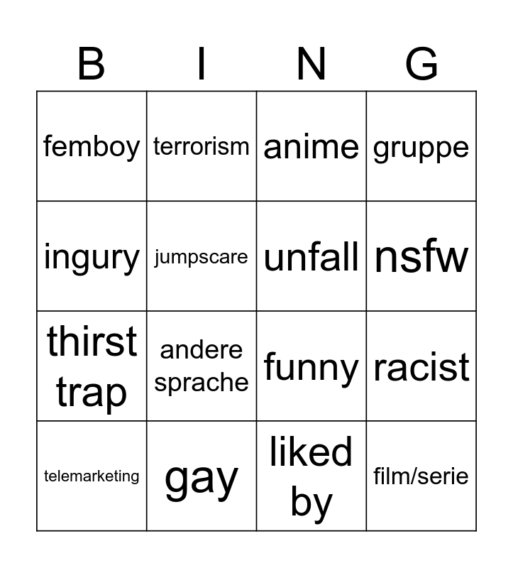 This bingo card has 16 words: gay, racist, anime, femboy, thirst trap, terrorism, funny, liked by, ingury, jumpscare, telemarketing, gruppe, andere sprache, nsfw, unfall and film/serie.