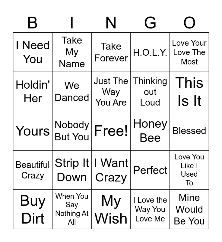 This bingo card has a free space and 74 words: Die With A Smile, Forever After All, Take Forever, you look like you love me, Your Man, In Case You Didn't Know, Wondering Why, Forever and Even, Amen, Buy Dirt, Think I'm In Love With You, Better Together, 4x4xU, Just The Way You Are, Holdin' Her, I Don't Dance, Nobody But You, What Ifs, This Is It, I'll Follow You, Yours, We Danced, Take My Name, H.O.L.Y., Love Like Crazy, Mine Would Be You, Heaven, Wanna Be That Song, Nobody, My Best Friend, Nothin' On You, Love Your Love The Most, Ride, never til now, Beauty in the Struggle, Always The Only One, I Love the Way You Love Me, I'm Already There, Made For You, Can't Have Mine, I Run To You, My Wish, When You Say Nothing At All, Baby I Am, Greatest Love Story, Tough Ones, I Need You, Good as You, Strip It Down, Johnny & June, My Girl, Chasing After You, From the Ground Up, Blessed, Someone, Eyes On You, Big, Big Plans, I Want Crazy, You Make It Easy, Look At Us, Love You Like I Used To, Thinking out Loud, All of Me, Beautiful Crazy, Tennessee Whiskey, Honey Bee, Slow Dance In A Parking Lot, Cowboys and Angels, Be My Baby, Perfect, A Guy with a Girl, Heaven, Five More Minutes, Houston, We Got A Problem and Lover,, Lover.